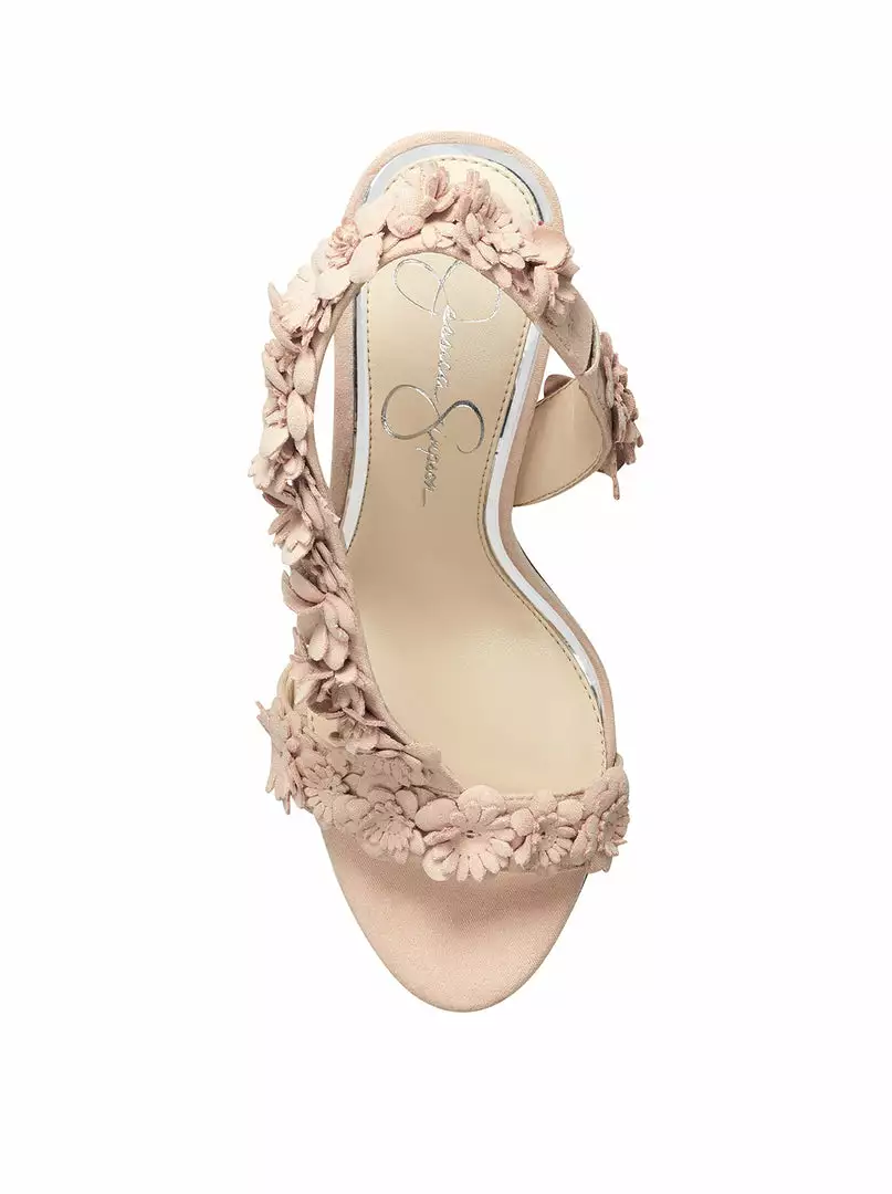 Floral embroidered strappy sandal.