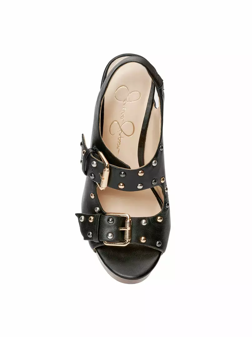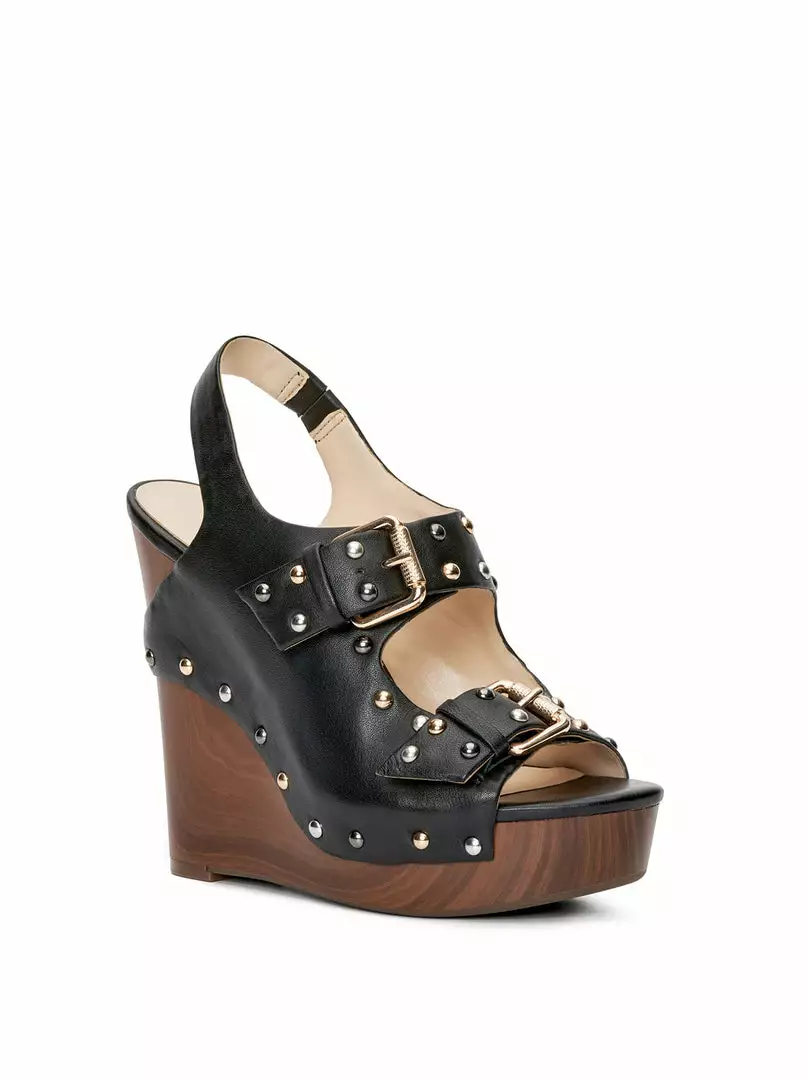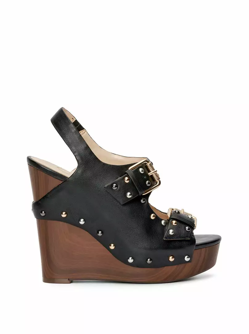 Platform Wedge Sandal with Ankle Strap, Stud and Buckle Detailing.