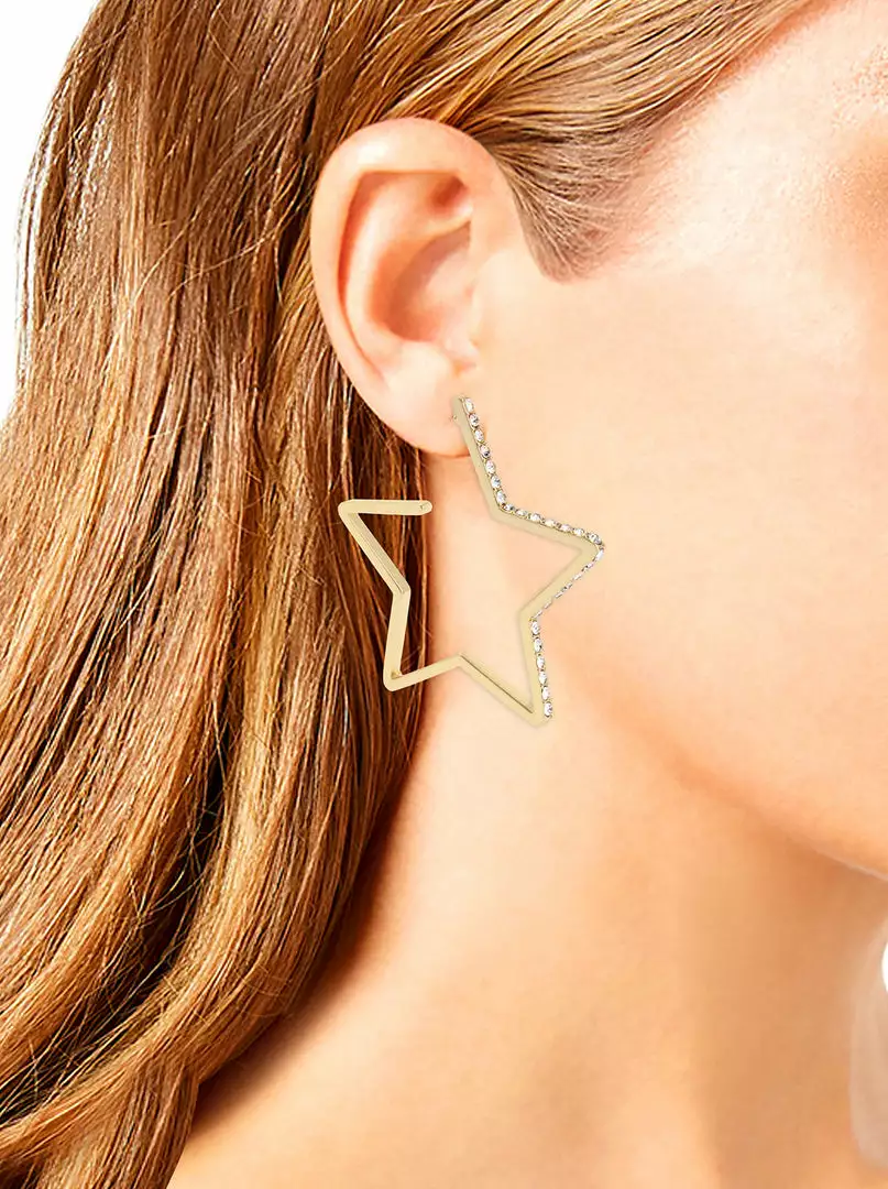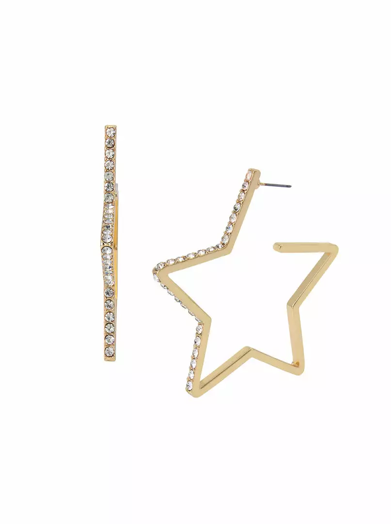 Sleek star open-hoop earrings adorned with fine crystal stones. These celestial earrings are set in gold-tone metal and have a post back closure.