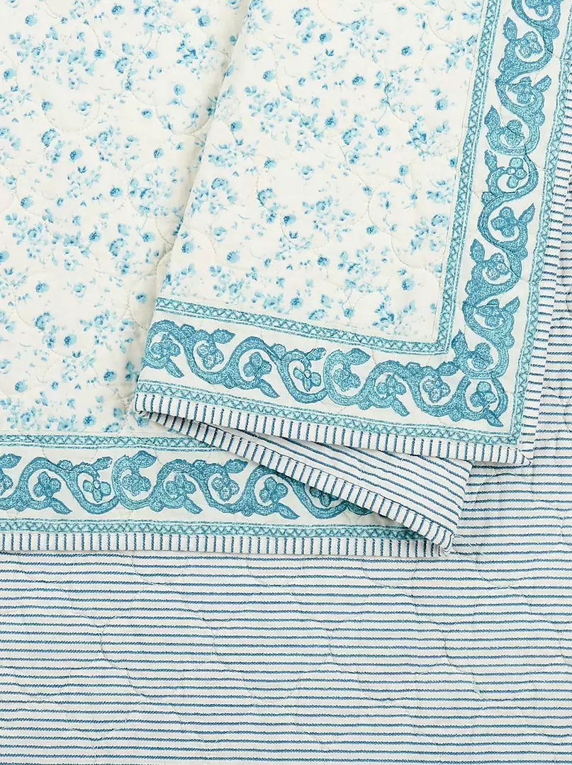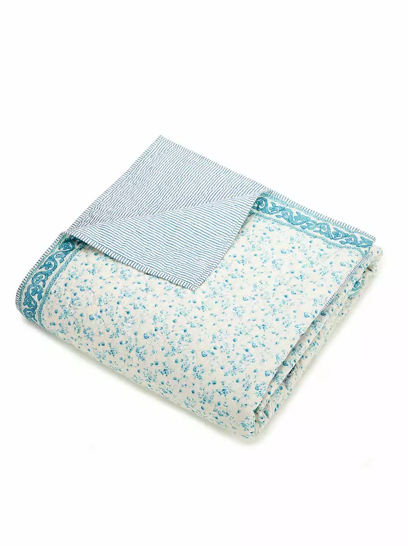 Dainty blue and white floral print quilt. Matching shams and decorative pillows are sold separately.