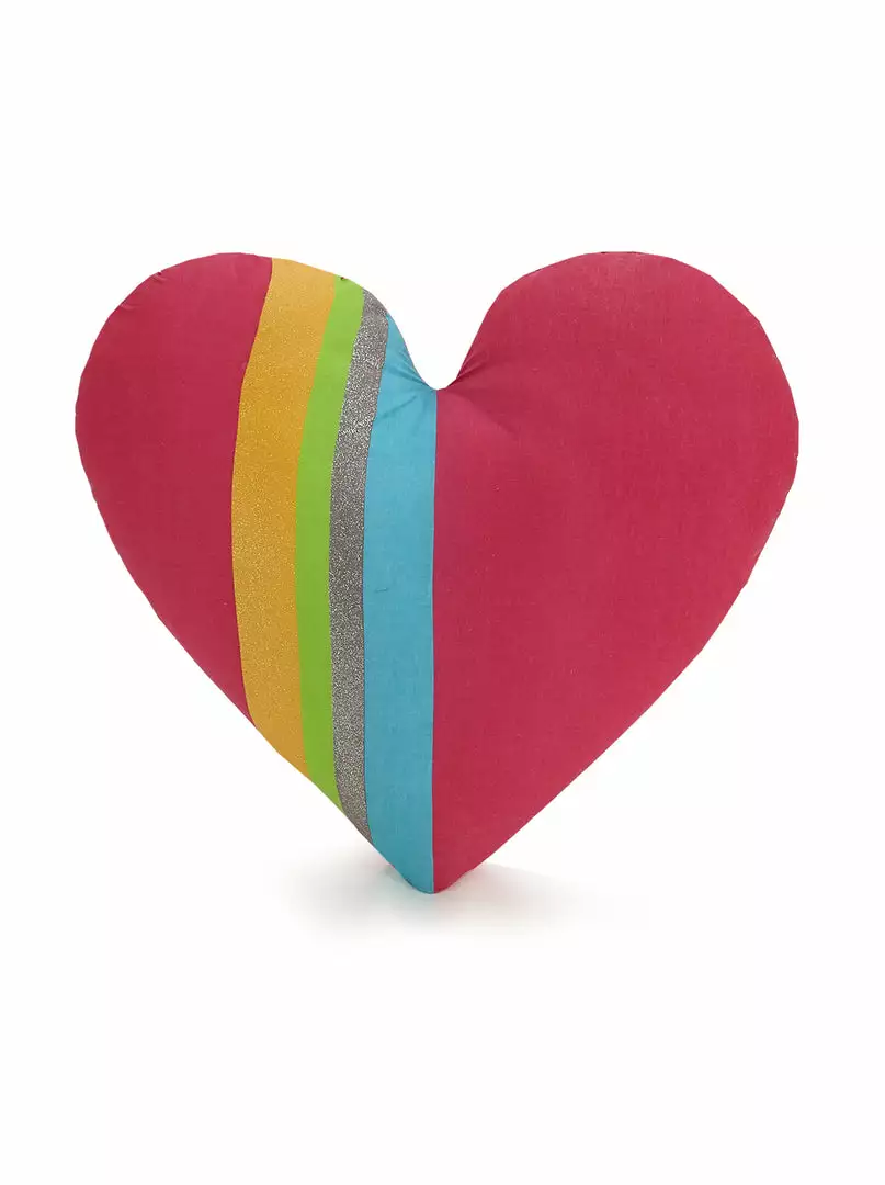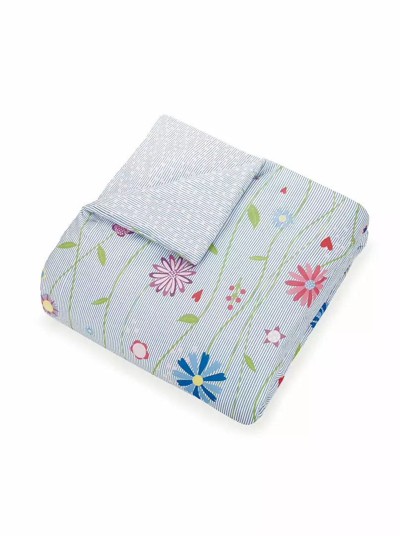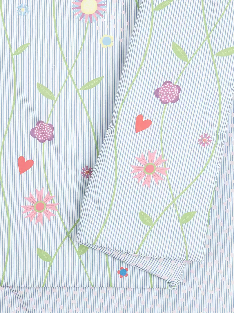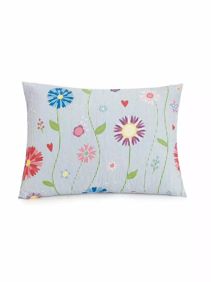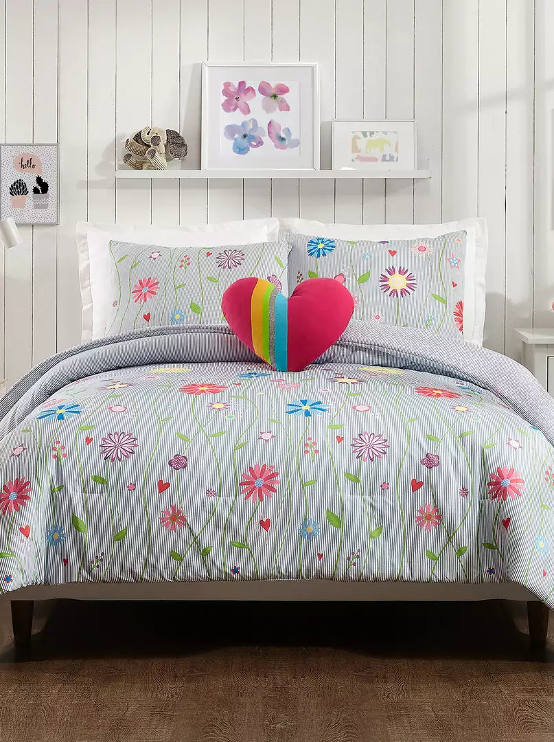Playful multi-colored flowers on a small blue and white pinstripe ground. Comes with matching shams and heart pillow.